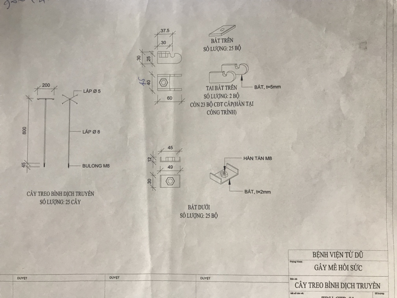Cây treo dịch truyền và máy bơm tiêm - Dùng ống tròn phi 19 Inox SUS 304 dầy 1.5mm. - Có pát inox dầy 5.0mm hàn vào đầu giường. - Thi công tại khuôn viên bệnh viện và lắp đặt tại khoa GMHS. |