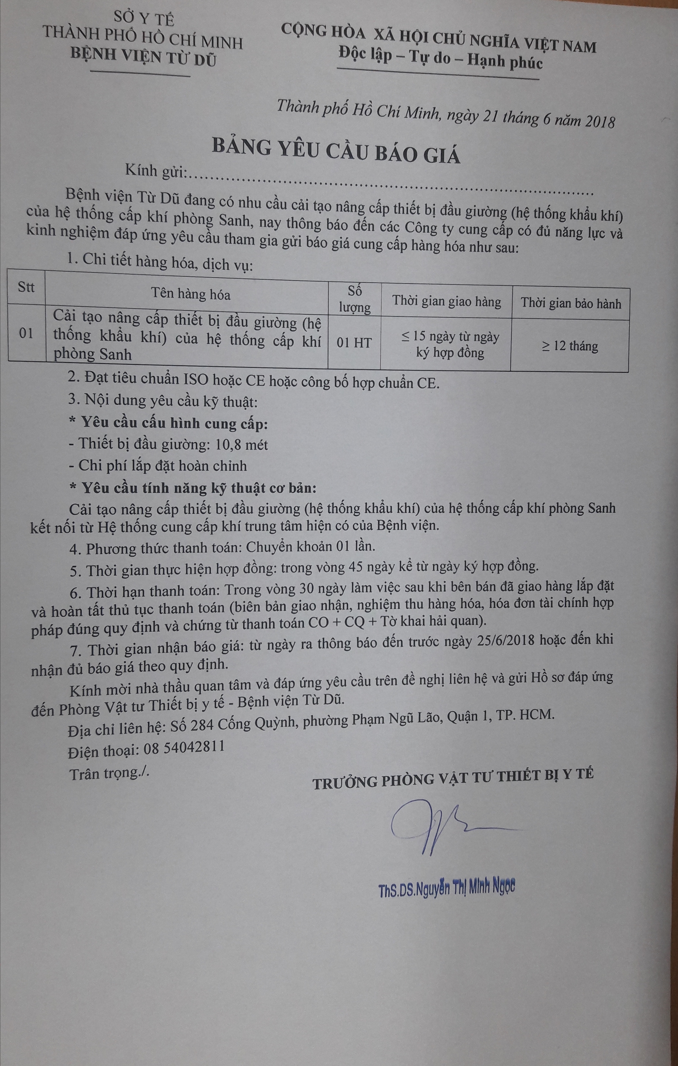 Bệnh viện Từ Dũ đang có nhu cầu cải tạo nâng cấp thiết bị đầu giường (hệ thống khẩu khí) của hệ thống cấp khí phòng Sanh, nay thông báo đến các Công ty cung cấp có đủ năng lực và kinh nghiệm đáp ứng yêu cầu tham gia gửi báo giá cung cấp hàng hóa như sau: