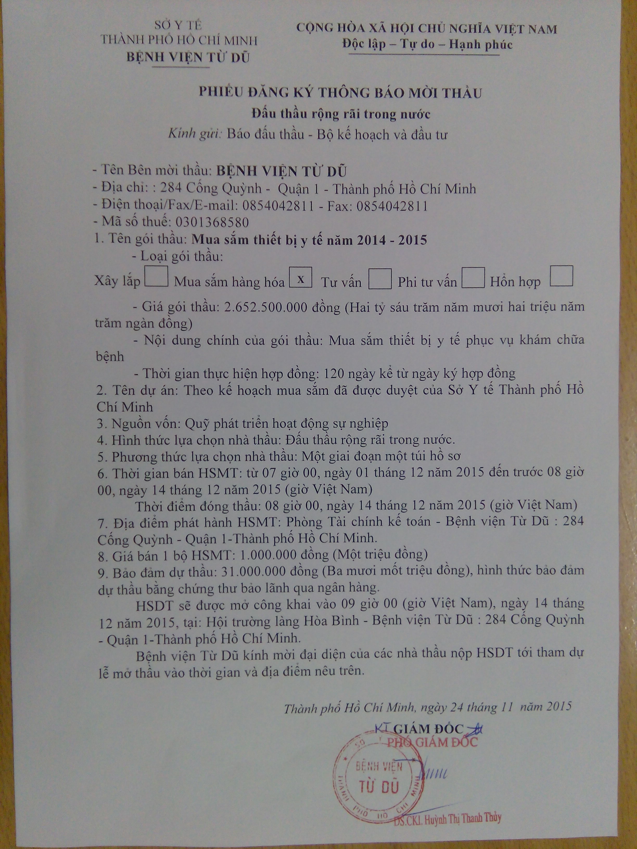HSDT sẽ được mở công khai vào 09 giờ 00 (giờ Việt Nam), ngày 14 tháng 12 năm 2015, tại: Hội trường làng Hòa Bình - Bệnh viện Từ Dũ : 284 Cống Quỳnh - Quận 1 - Thành phố Hồ Chí Minh.