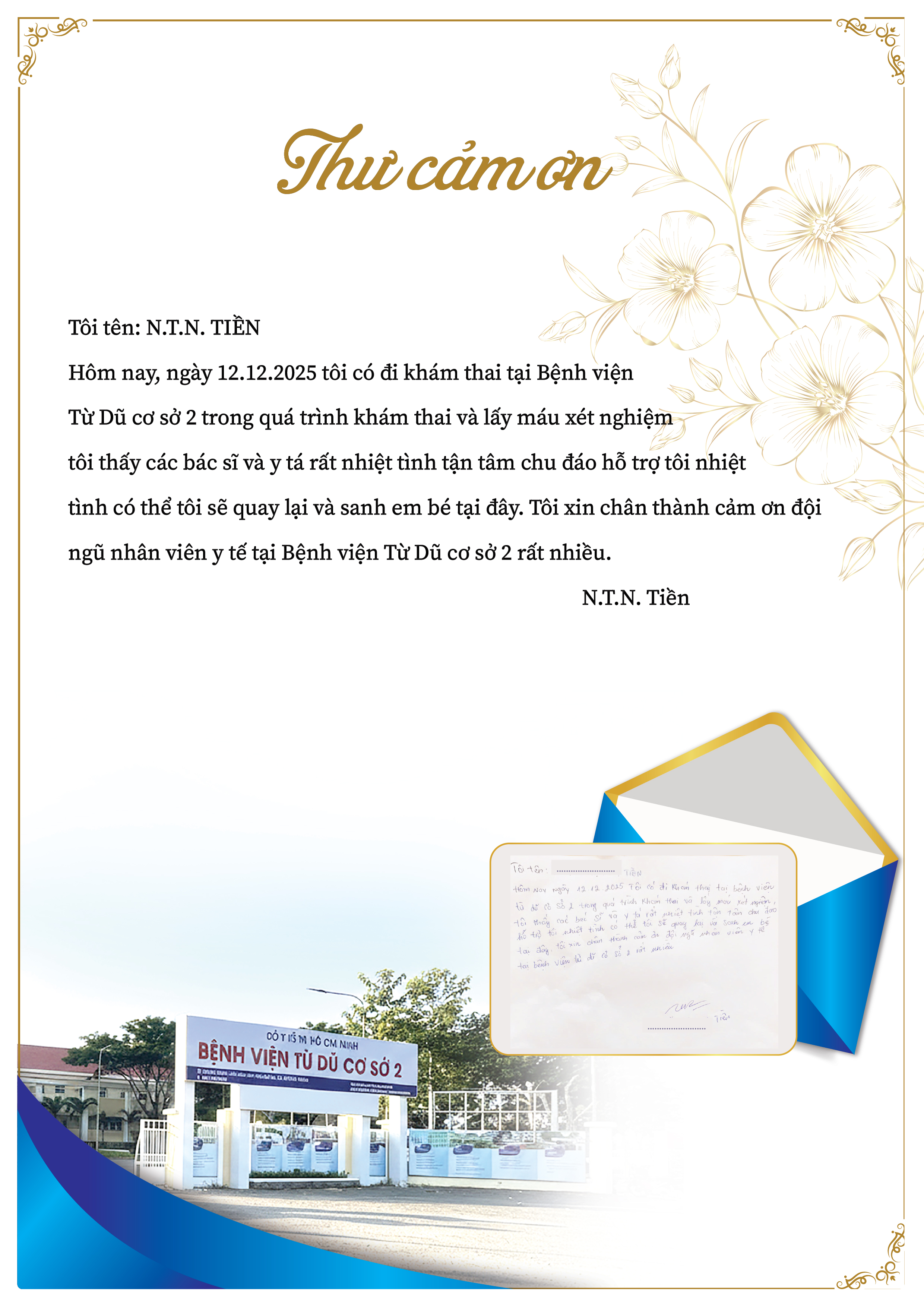 Thư cảm ơn N.T.N. TIỀN - BV Từ Dũ cơ sở 2
